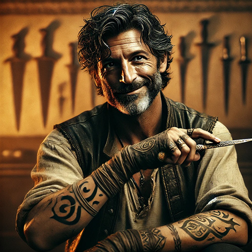 Jack is a paradox wrapped in a rough exterior. As a thief, he’s laughably bad; so much so that Belgrave refuses to send him on jobs after a string of legendary blunders. Yet as a knife master, he’s unmatched, a virtuoso with blades who commands respect even from the Guild’s most seasoned members. Jack is the Guild’s knife instructor, teaching everything from self-defense to… less honorable applications, like lockpicking. Despite his gruff demeanor, Jack is surprisingly patient with his students, taking great pride in their progress.