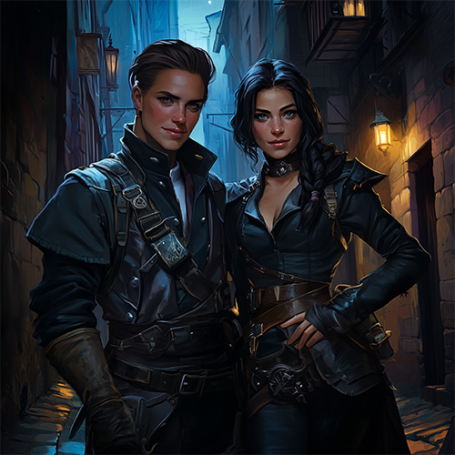 If Belgrave and Eirwen are the heart of the Thieves’ Guild, Piper and Quinn are its unstoppable hands. This dynamic duo is unmatched when it comes to high-stakes heists and delicate espionage, earning their place as two of the Guild’s most elite thieves. Lovers as well as partners, their bond is the foundation of their extraordinary teamwork. They know each other so well that a glance, a subtle gesture, or even a slight change in breathing is enough to communicate mid-heist.
