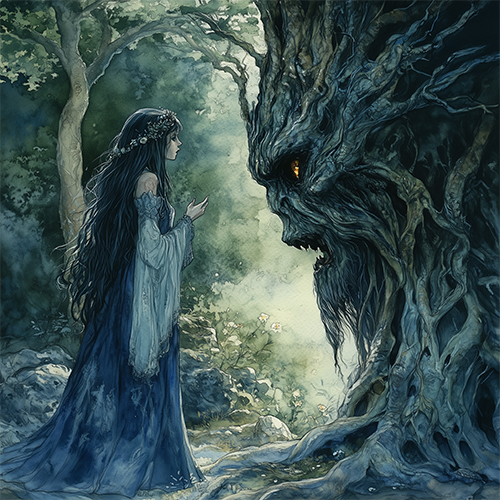 A young Faedark O’Wyrdkin listens patiently to a particularly grumpy Elderhollow, its face twisted in displeasure. A noisy family of squirrels has overstayed their welcome, and with her calming presence, the witch offers her help, bridging harmony between the forest’s ancient guardians and its lively inhabitants.