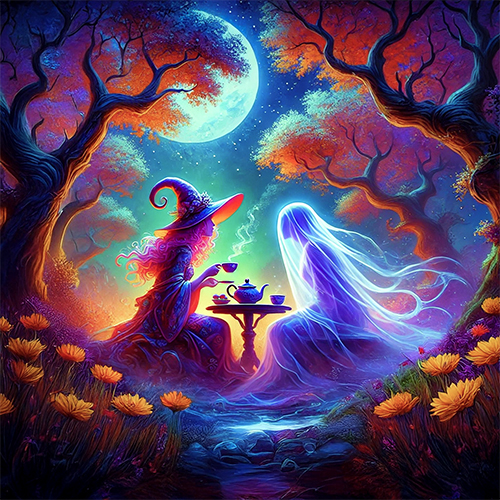 A Wyrdkin witch shares a cozy cup of Ethereal Bloom Tea with a ghostly ancestor in the Barrowold during the Wyrdmeet, when the veil between worlds is at its thinnest.